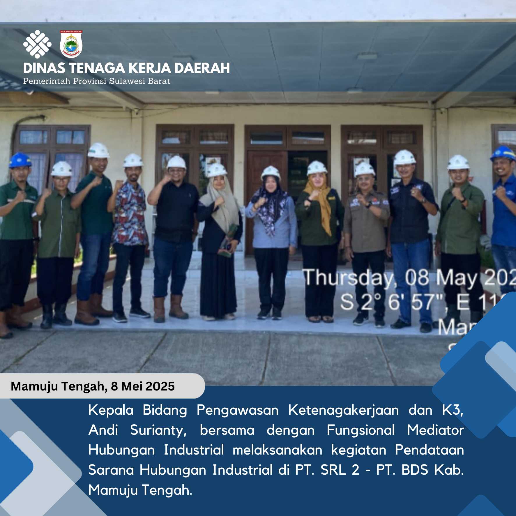 Kepala Bidang Pengawasan Ketenagakerjaan dan K3, Andi Surianty, bersama dengan Fungsional Mediator Hubungan Industrial melaksanakan kegiatan Pendataan Sarana Hubungan Industrial di PT. SRL2 – PT. BDS Kab. Mamuju Tengah.
