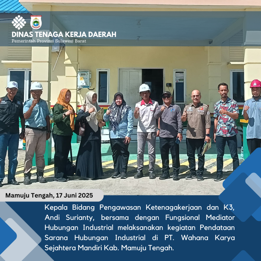 Kepala Bidang Pengawasan Ketenagakerjaan dan K3, Andi Surianty, bersama dengan Fungsional Mediator Hubungan Industrial melaksanakan kegiatan Pendataan Sarana Hubungan Industrial di PT. Wahana Karya Sejahtera Mandiri Kab. Mamuju Tengah.