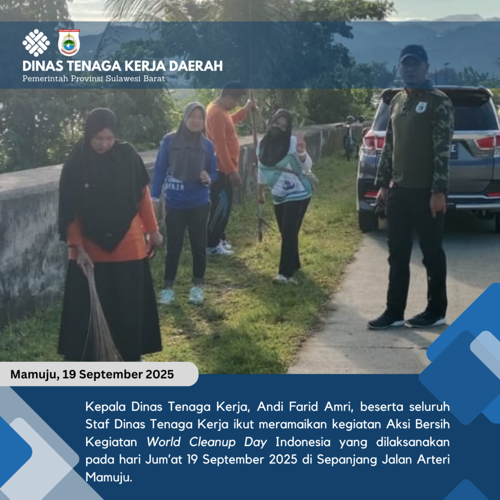 Kepala Dinas Tenaga Kerja, Andi Farid Amri, beserta seluruh Staf Dinas Tenaga Kerja ikut meramaikan kegiatan Aksi Bersih Kegiatan World Cleanup Day Indonesia yang dilaksanakan pada hari Jum’at 19 September 2025 di Sepanjang Jalan Arteri Mamuju.