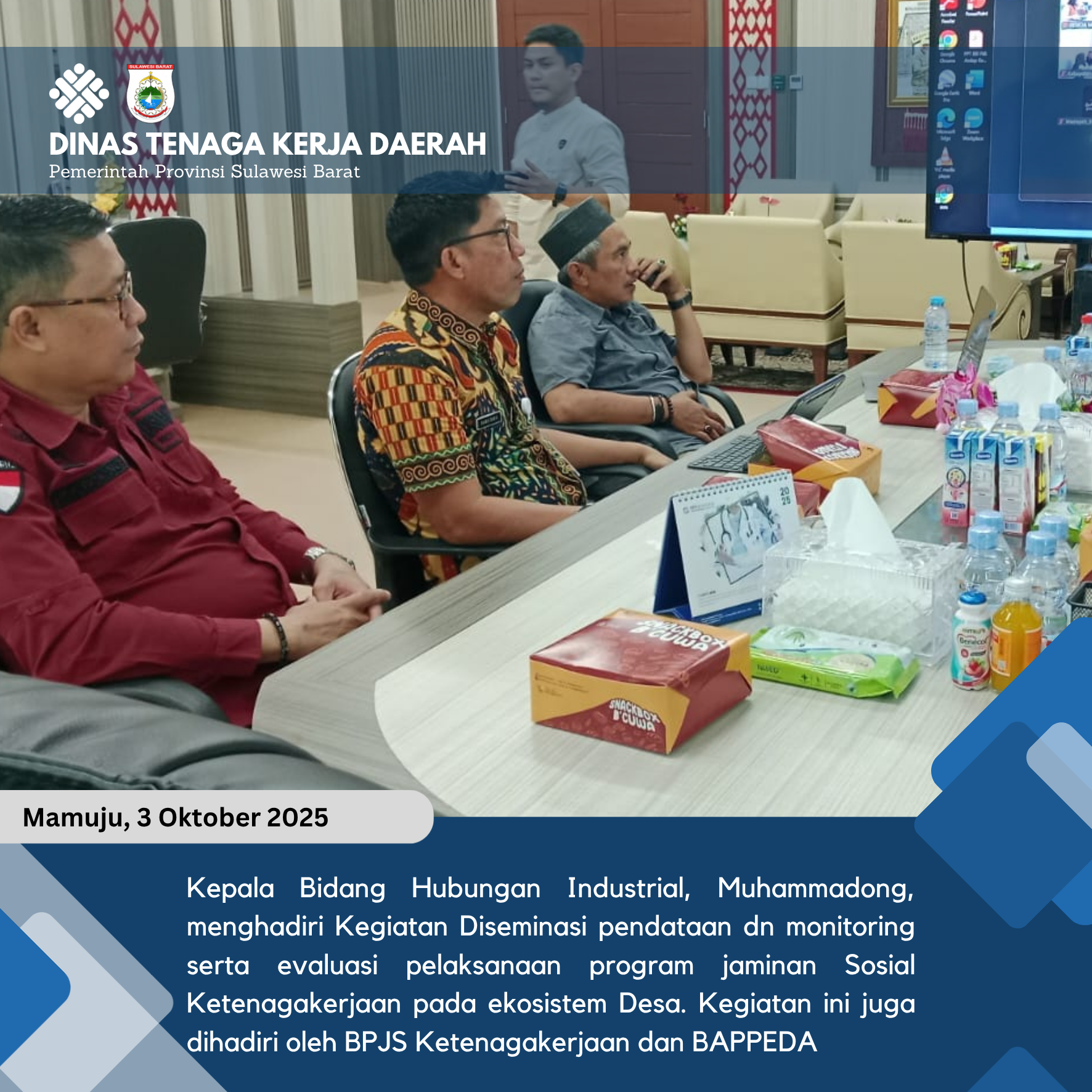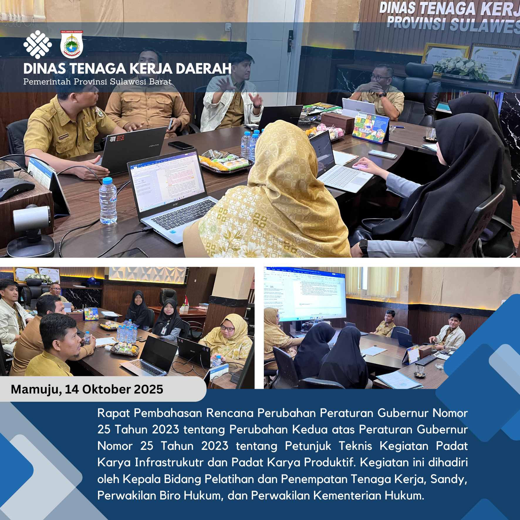 Rapat Pembahasan Rencana Perubahan Peraturan Gubernur Nomor 25 Tahun 2023 tentang Perubahan Kedua atas Peraturan Gubernur Nomor 25 Tahun 2023 tentang Petunjuk Teknis Kegiatan Padat Karya Infrastrukutr dan Padat Karya Produktif. Kegiatan ini dihadiri oleh Kepala Bidang Pelatihan dan Penempatan Tenaga Kerja, Sandy, Perwakilan Biro Hukum, dan Perwakilan Kementerian Hukum.