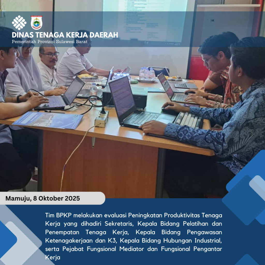 Tim BPKP melakukan evaluasi peningkatan produktivitas tenaga kerja yang dihadiri Sekretaris Dinas, Kepala Bidang Pelatihan dan Penempatan Tenaga Kerja, Kepala Bidang Pengawasan Ketenagakerjaan, Kepala Bidang Hubungan Industrial, serta Pejabat Fungsional Pengantar Kerja dan Fungsional Mediator Hubungan Industrial.